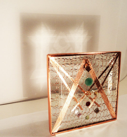 So, when I asked I was told that this tool is made out of quartz, copper and the image of a Seraph and Sephirot. The image that you see on this tool as you can see here is of a Seraph and weaving an intricate design of the portal into the ethers. The gemstones that are placed on the tool are the ones that balance all 7 of your chakras (Amethyst, Smokey quartz, Citrine, Blue Topaz, Peridot, Green onyx ,Garnet )combining to create a kaleidoscope of lights, activating a rainbow frequency within your being allowing you to connect to activate the 10 emanations of the Three of Life.