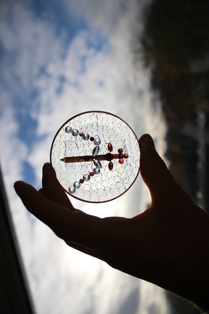 It measures 3 inches in diameter. It is made of specialized quartz glass, cut to reflect the light in such a way as to amplify the power of the cosmic energies.